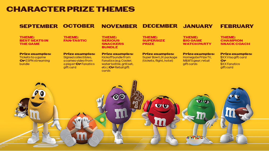 In an effort to revive unused creative ideas, M&M'S tasked us with focusing on the 'huddle' theme for their upcoming NFL program while engaging shoppers for six months. Here is what we developed: monthly NFL-themed prizes tailored to the personalities of our M&M'S characters—perfect for all types of fans! Although this program never came to fruition, I still believe the concept has merit and wanted to give it the recognition it deserves.